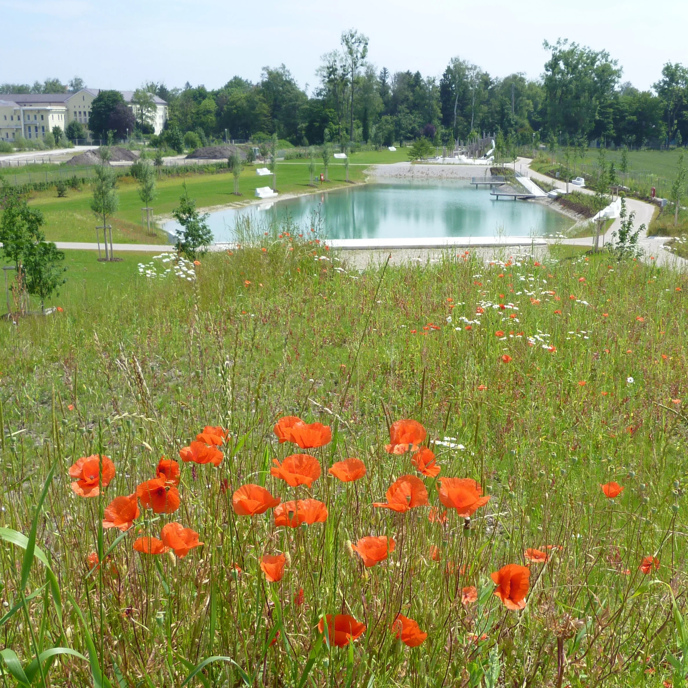 Der 3 ha große Park verbindet Karlsfeld-West mit der angrenzenden Kulturlandschaft. Die Nordseite des Parks hält mit weitläufigen Rasen- und Wiesenflächen die Blickbeziehungen frei. Im Süden sind verschiedene Aktions- und Erlebnisräume angeordnet. Die Kiessande des Seeaushubes sind Thema für die Herstellung unterschiedlicher Vegetationsstandorte und Ortbetonflächen. So entsteht ein nachhaltiger, naturnaher Park der bezüglich Nutzeransprüchen und Klimaveränderungen wandelbar bleibt.